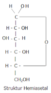 2. Struktur hemi-asetal adalah struktur yang terbentuk ketika molekul monosakarida mengalami reaksi intramolekul. Reaksi intra molekul ini biasanya terjadi di dalam larutan berair, dimana gugus alkohol dari atom C kiral terjauh menyerang gugus karbonil pada atom C1. Struktur ini lebih stabil yaitu struktur siklik/cincin dengan 6 atom C yang disebut dengan cincin piranosa.