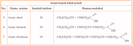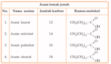 Lemak tergolong ester . Lemak sederhana adalah trigliserida yang terbuat dari sebuah molekul gliserol yang terikat pada tiga asam karboksilat (asam lemak). Pada dasarnya asam lemak dibedakan menjadi asam lemak jenuh dan asam lemak tidak jenuh. Dikatakan jenuh, jika molekulnya hanya mempunyai ikatan tunggal. Adapun dikatakan tidak jenuh berarti molekulnya mempunyai ikatan rangkap di antara atomnya. Perhatikan struktur asam lemak jenuh dan asam lemak tidak jenuh pada tabel berikut.