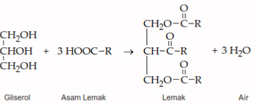 Molekul lemak terbentuk dari gabungan tiga molekul asam lemak dengan satu molekul gliserol. Perhatikan reaksi berikut