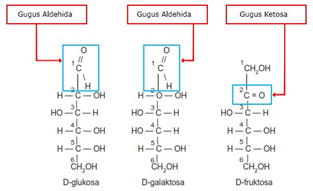 Glukosa dan galaktosa merupakan kelompok aldosa, yaitu memiliki gugus fungsi aldehid(aldoheksosa). Sedangkan fruktosa merupakan kelompok ketosa yang memiliki gugus fungsi keton( ketoheksosa) Setiap monosakarida memiliki dua bentuk konfigurasi yaitu D (dekstro ) dan L (Levo). Penentuan bentuk D dan L didasarkan pada arah gugus -OH pada atom C asimetris nomor terbesar.
